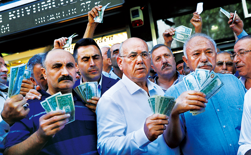 2018年,由于美聯(lián)儲加息導致國際游資大規(guī)?;亓鳎绹鴮ν炼?、伊朗進行制裁以及貿易保護主義的影響,俄羅斯、阿根廷、土耳其、南非等不少經濟體貨幣遭遇大幅貶值。圖為2018年8月14日,在土耳其首都安卡拉,人們響應政府號召,手持美元站在貨幣兌換處前,出售手中的美元支持本國貨幣里拉。 新華社/路透