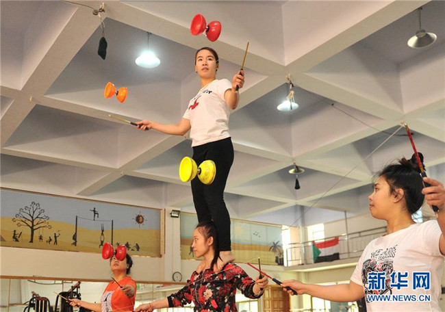 5月20日,在吳橋雜技藝術(shù)學(xué)校,留學(xué)生練習(xí)雜技。新華社發(fā)(苑立偉 攝)