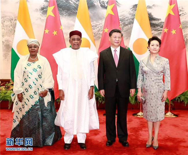 5月28日,國(guó)家主席習(xí)近平在北京人民大會(huì)堂同尼日爾總統(tǒng)伊素福舉行會(huì)談。這是習(xí)近平和夫人彭麗媛同伊素福夫婦合影。 新華社記者 龐興雷 攝