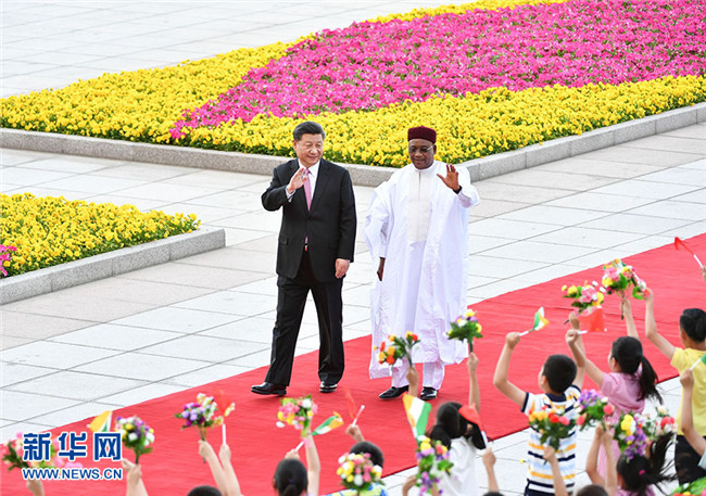 5月28日,國(guó)家主席習(xí)近平在北京人民大會(huì)堂同尼日爾總統(tǒng)伊素福舉行會(huì)談。這是會(huì)談前,習(xí)近平在人民大會(huì)堂東門(mén)外廣場(chǎng)為伊素福舉行歡迎儀式。 新華社記者 殷博古 攝