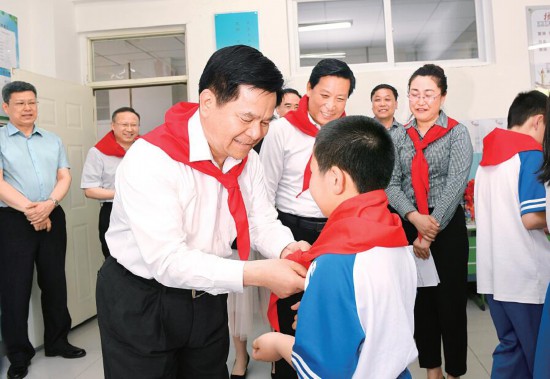 李紀恒來到一年級二班,“愛祖國、擔(dān)大任,爭做新時代好隊員”主題隊日活動正在舉行,一名少先隊員走上前來,為他戴上鮮艷的紅領(lǐng)巾。李紀恒說,看到小朋友們快樂活潑、朝氣蓬勃,我很高興,“六一”國際兒童節(jié)快到了,我提前祝大家和全區(qū)的小朋友們節(jié)日快樂、學(xué)習(xí)進步、健康成長。