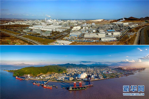 上圖:煙臺(tái)萬華化學(xué)集團(tuán)第一條MDI生產(chǎn)線全面停產(chǎn)后拆除;下圖:建設(shè)中的煙臺(tái)合成革廠(煙臺(tái)萬華化學(xué)集團(tuán)前身)MDI生產(chǎn)線。新華社發(fā)