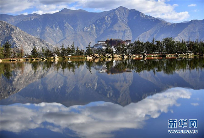 6月5日拍攝的藍(lán)天白云和綠水之間的布達(dá)拉宮。新華社記者 覺果 攝
