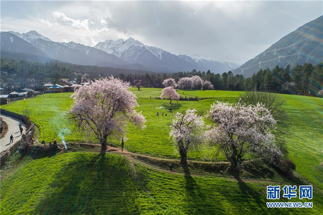 西藏林芝波密縣境內(nèi)桃花盛開的田園風(fēng)光(4月5日無人機(jī)拍攝)。新華社記者 李鑫 攝