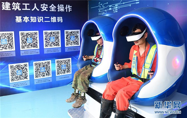 6月5日,重慶化龍橋超高層項目工人在VR安全體驗館內(nèi)通過特種標識識別系統(tǒng)學習安全標識。新華社記者 王全超 攝