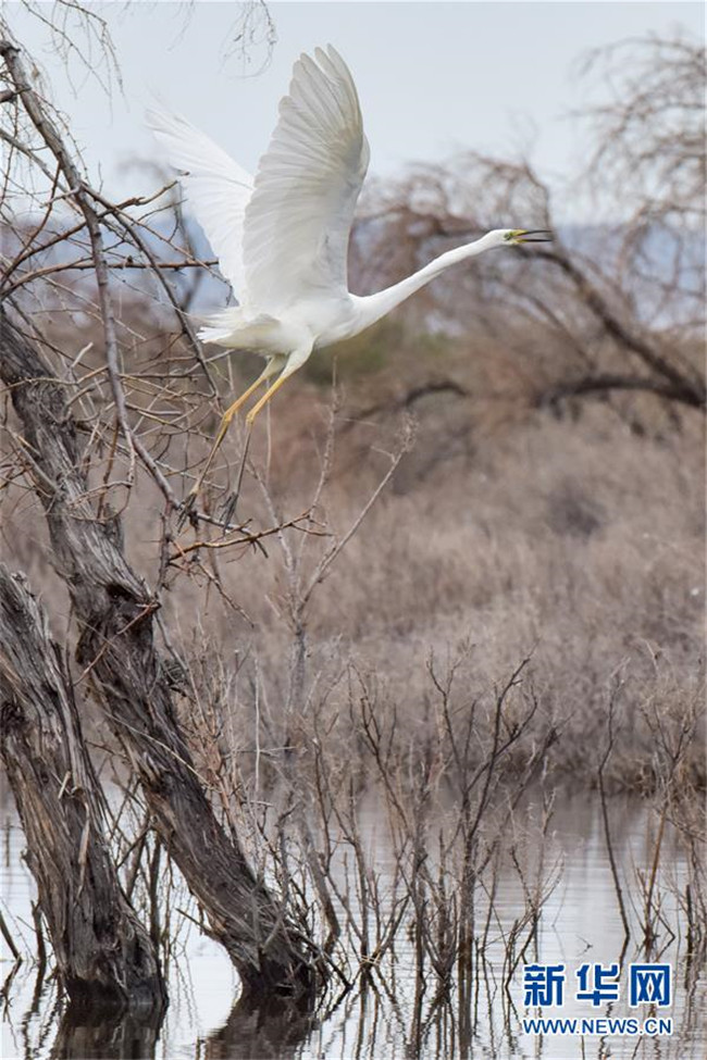 6月9日,一只白鷺在新疆烏倫古湖國(guó)家濕地公園飛翔。新華社記者 丁磊 攝