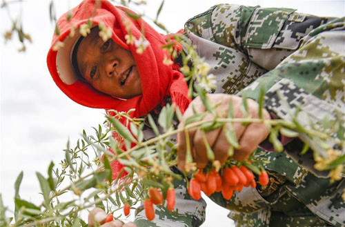 6月11日,寧夏紅寺堡生態(tài)移民區(qū)的移民在百瑞源原生態(tài)枸杞種植基地采摘頭茬枸杞。 新華社發(fā)(馮開華 攝)