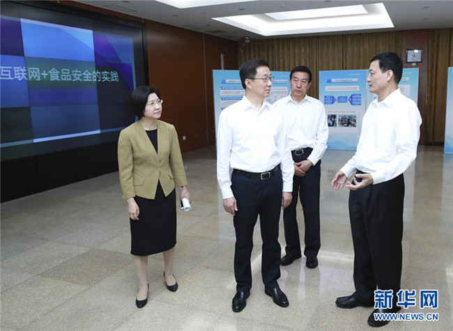 6月13日,在2019年全國(guó)食品安全宣傳周活動(dòng)前夕,中共中央政治局常委、國(guó)務(wù)院副總理、國(guó)務(wù)院食品安全委員會(huì)主任韓正到國(guó)務(wù)院食品安全委員會(huì)辦公室主持召開座談會(huì),聽取對(duì)食品安全工作的意見建議。這是會(huì)前,韓正參觀食品安全工作情況展示,考察了解食品安全智慧監(jiān)管的創(chuàng)新舉措。新華社記者龐興雷攝
