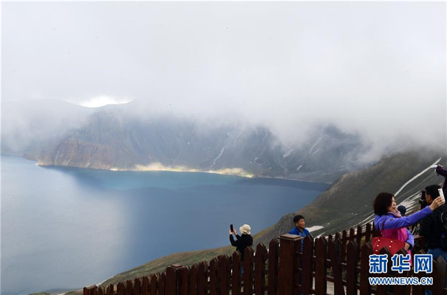 游客在長(zhǎng)白山天池游覽拍照(6月14日攝)。