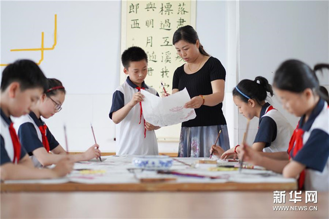 6月26日,內丘縣實驗小學老師在指導學生練習國畫創(chuàng)作。新華社記者 朱旭東 攝