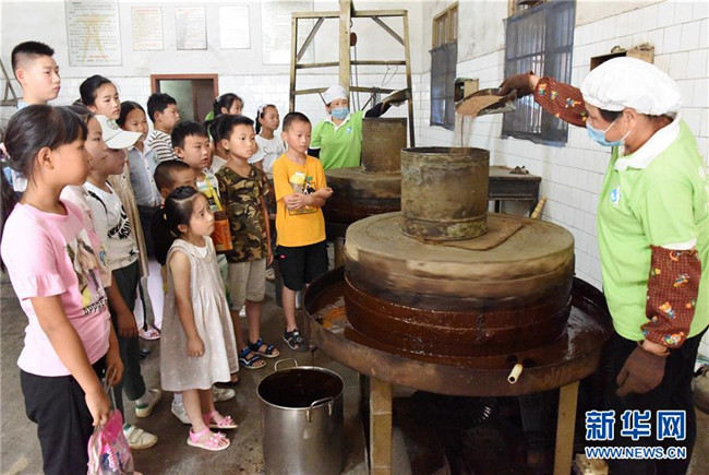 7月2日,安徽省銅陵市大通鎮(zhèn)中心學(xué)校學(xué)生在暑期社會(huì)實(shí)踐活動(dòng)中參觀大通小磨麻油制作過(guò)程。 新華社發(fā)(過(guò)仕寧 攝)