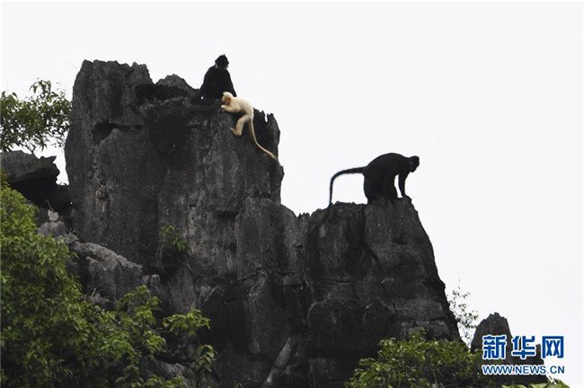 7月4日,白化黑葉猴幼體和同種群其他黑葉猴出現(xiàn)在廣西大新縣桃城鎮(zhèn)寶新村城南小學(xué)后山上。新華社記者 曹祎銘 攝