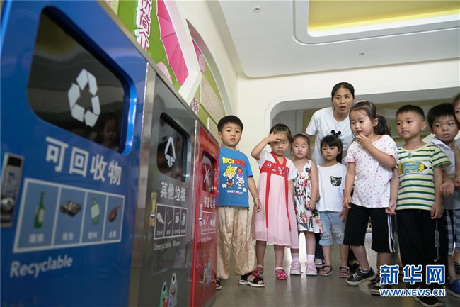 7月4日,德清縣乾元鎮(zhèn)第一幼兒園小朋友們在唱垃圾分類兒歌。新華社記者 郭緒雷 攝