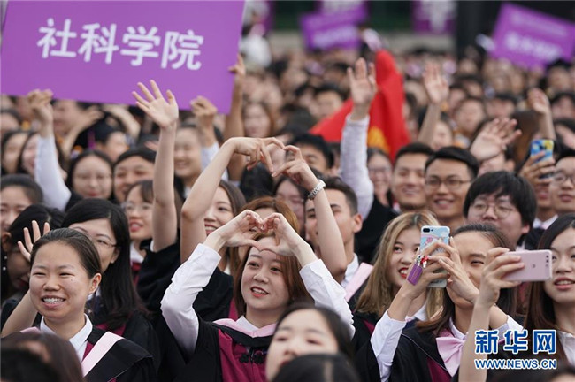7月7日,一名清華大學(xué)2019年本科畢業(yè)生在畢業(yè)典禮上與校訓(xùn)“自強(qiáng)不息,厚德載物”中的“強(qiáng)”字合影。