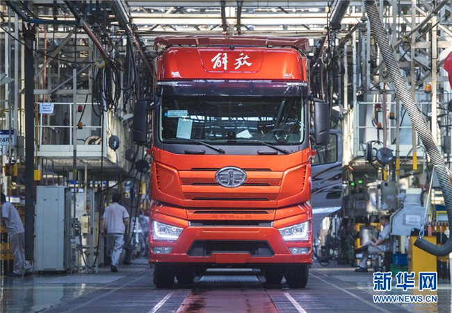 這是在位于吉林長(zhǎng)春的一汽解放總裝車間內(nèi)拍攝的待出廠的解放J7卡車(6月12日攝)。新華社記者許暢攝