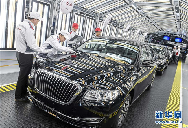 工人在位于吉林長(zhǎng)春的一汽紅旗總裝車間內(nèi)進(jìn)行車輛靜檢作業(yè)(4月9日攝)。新華社記者許暢攝