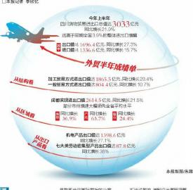 個體的表現(xiàn)匯聚成上半年四川外貿(mào)成績單:貨物貿(mào)易進(jìn)出口總值達(dá)3033億元,同比增長21.9%,遠(yuǎn)高于同期全國3.9%的整體進(jìn)出口增幅。