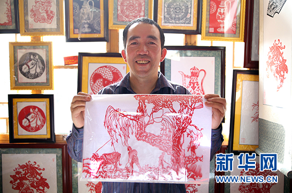 紅崖老巷子民俗村“剪紙情郎”楊國(guó)權(quán)向記者展示剪紙作品。 新華網(wǎng) 肖寒 攝