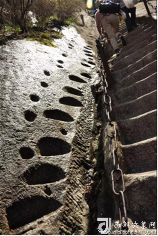 第二道險關(guān)是百尺峽。這里兩壁高聳,中間夾著一塊從天而降的巨石,上刻“驚心石”三個大字,游人從石下小路穿過,確實驚心動魄。第三道險關(guān)是老君犁溝,這是夾在陡峭石壁之間的一條溝狀險道,有570多個石階。相傳這里原先根本沒有路,太上老君見了,就將手中的如意柄變成一張鐵犁, 又牽來青牛,一夜間犁成了這條山溝。傳說青牛犁完溝后,見華山景色壯美,便化為石牛,永遠(yuǎn)地留在了華山之上。溝的盡頭是一道陡壁, 名為“猢猻愁”。顧名思義,連猴子都發(fā)愁,可見這里的山勢多么陡峭。