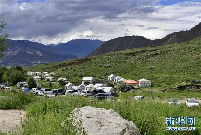 這是達東村景區(qū)的帳篷和旅游車輛(7月20日攝)。西藏拉薩市柳梧鄉(xiāng)達東村是一個千年古村,也曾是一個貧困村。近年來,依托秀美的自然風光、深厚的歷史文化和淳樸的風土人情,當?shù)卣畬嵤┪幕糜萎a(chǎn)業(yè)精準扶貧,使達東村蛻變成為鄉(xiāng)村旅游勝地。新華社記者張汝鋒攝