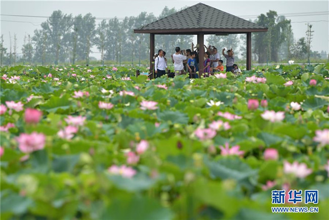 在江西省南昌市新建區(qū)聯(lián)圩鎮(zhèn),游客在當(dāng)?shù)氐那М€荷花園觀賞游玩(7月20日攝)。新華社記者 彭昭之 攝