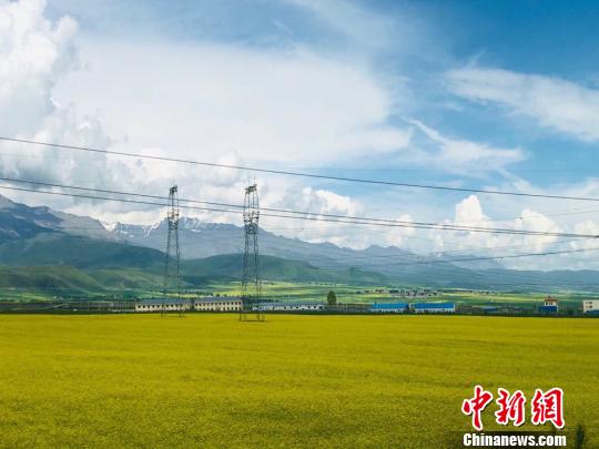 祁連山脈雪頂銀裝素裹,與油菜花交相輝映?!堟骸z