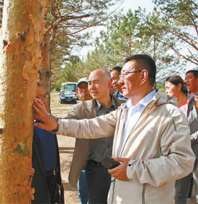 于??。ㄇ埃┡c苗木專家在察看林場(chǎng)樹木。新華社發(fā)