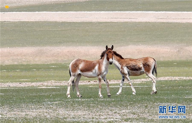 8月4日拍攝的兩頭藏野驢。西藏那曲市尼瑪縣位于西藏西北部,位于羌塘國(guó)家級(jí)自然保護(hù)區(qū)內(nèi),是古老象雄文明的發(fā)祥地之一。這里空氣潔凈,野生動(dòng)物繁多,深受游客喜愛。新華社記者覺(jué)果攝