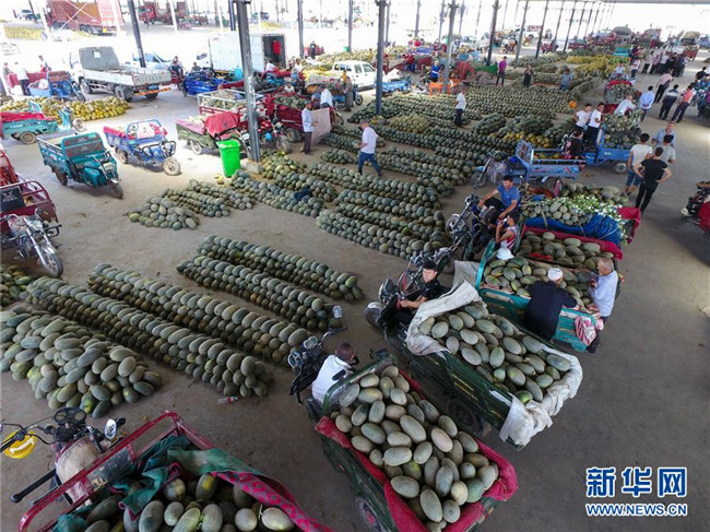 在新疆果品(伽師)批發(fā)交易市場,瓜農(nóng)在分揀伽師瓜,準(zhǔn)備外運(yùn)銷售(8月10日攝)。新華社記者 丁磊 攝