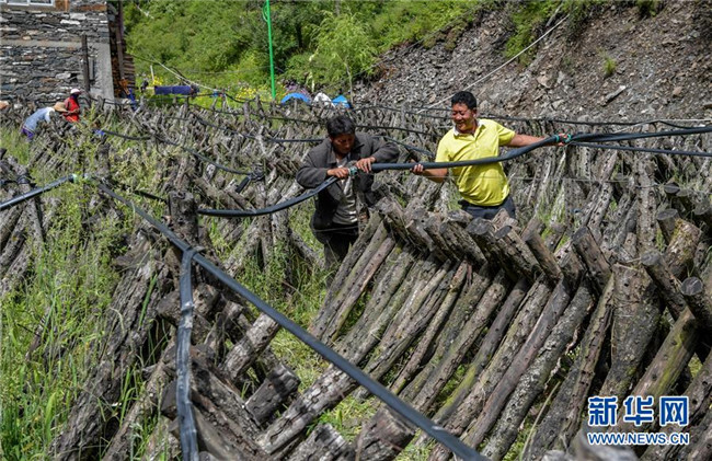 8月10日,東方電氣集團(tuán)東方汽輪機(jī)有限公司駐村扶貧干部侯吉才(右)和村民一起為青杠木耳基地更換噴淋水管。新華社記者 張超群 攝