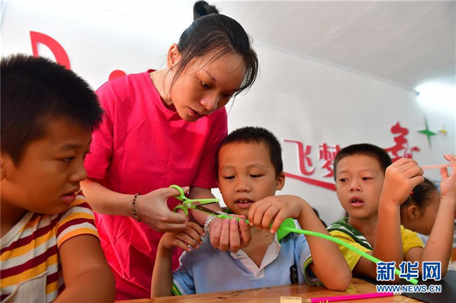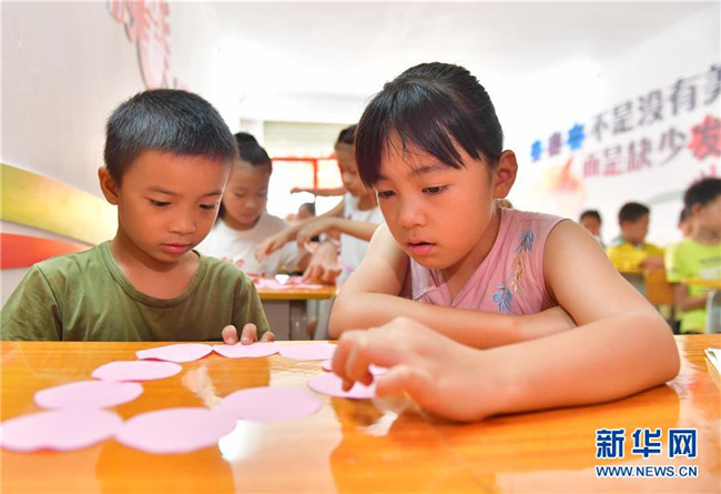 8月17日,在廣西柳州市融安縣“老鄉(xiāng)家園”,孩子們在“七彩假期”手工課上學做手工。新華社記者 黃孝邦 攝