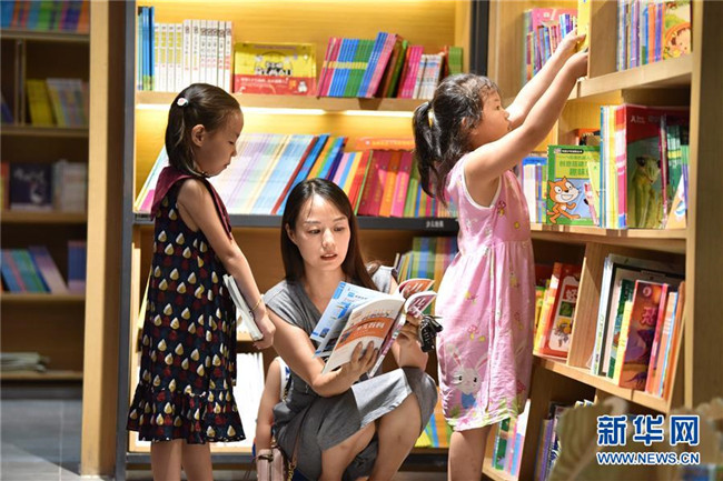 8月18日,在河北省定州市新華書店,小朋友在家長的陪伴下挑選圖書。