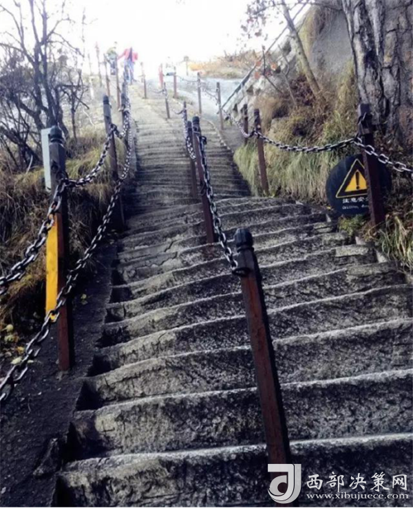 在從南峰到東峰的山路上還有兩處景點(diǎn):一是"避詔崖",著名道士陳摶,為躲避皇帝征召曾避居此處的山洞中;另一處是絕壁千丈而不見(jiàn)底的長(zhǎng)空棧道,棧道依懸崖開(kāi)鑿,游人需手扶鐵索木欄而過(guò),是華山上又一險(xiǎn)處。