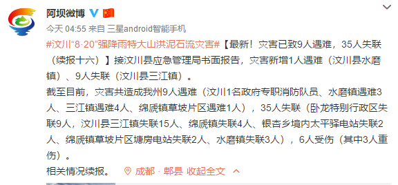 據(jù)阿壩州委外宣辦官方微博消息,接汶川縣應(yīng)急管理局書(shū)面報(bào)告,災(zāi)害新增1人遇難(汶川縣水磨鎮(zhèn))、9人失聯(lián)(汶川縣三江鎮(zhèn))。