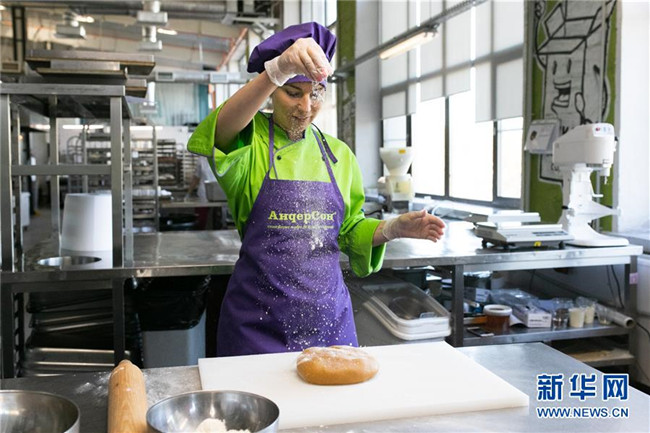 8月28日,在俄羅斯首都莫斯科,糕點(diǎn)師尤利婭將干面粉撒在揉好的面團(tuán)上。 新華社記者 白雪騏 攝
