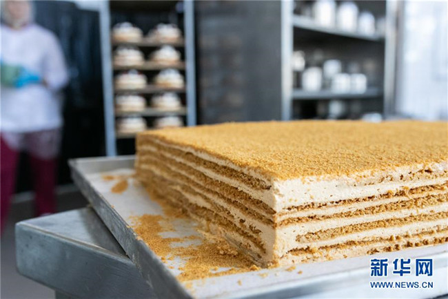 這是8月28日在俄羅斯首都莫斯科拍攝的制作完成的俄式蜂蜜蛋糕。 新華社記者 白雪騏 攝