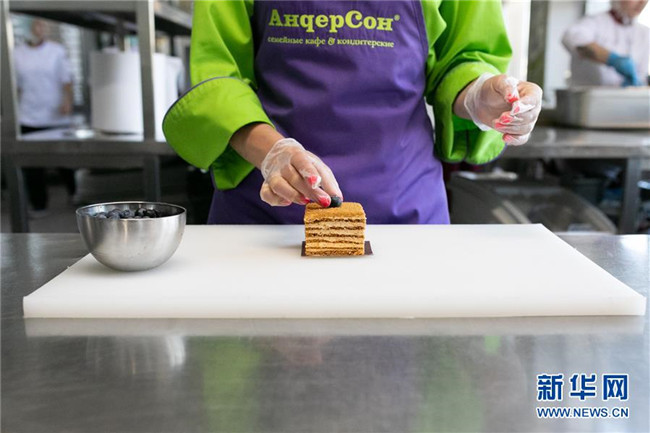 8月28日,在俄羅斯首都莫斯科,糕點(diǎn)師尤利婭將藍(lán)莓?dāng)[放在分切好的蜂蜜蛋糕上。 新華社記者 白雪騏 攝