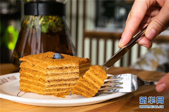 這是8月28日在俄羅斯首都莫斯科的一家咖啡廳內(nèi)拍攝的俄式蜂蜜蛋糕。 新華社記者 白雪騏 攝