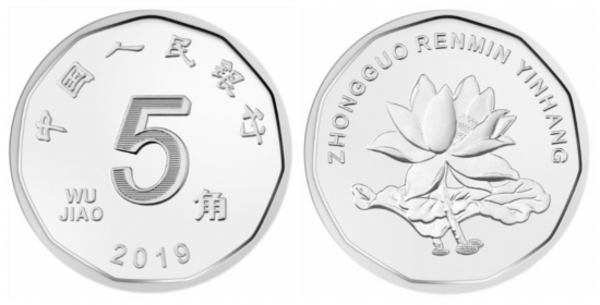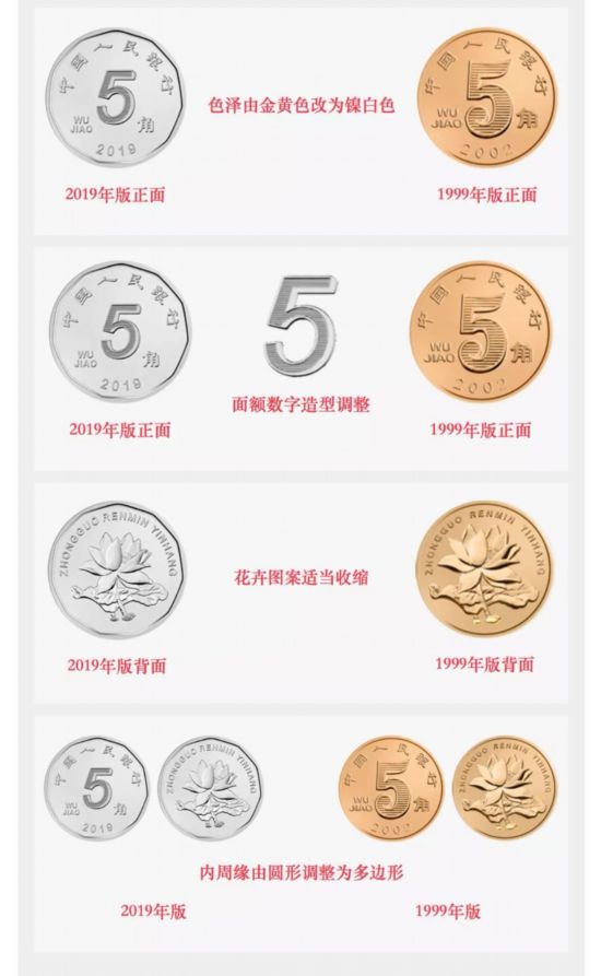 值得一提的是,5角硬幣材質由鋼芯鍍銅合金改為鋼芯鍍鎳,色澤由金黃色改為鎳白色。正背面內周緣由圓形調整為多邊形。直徑保持不變。