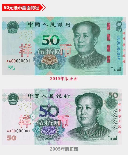 此外,2019年版第五套人民幣50元、20元、10元、1元紙幣調整正面毛澤東頭像、裝飾團花、橫號碼、背面主景和正背面面額數(shù)字的樣式,增加正面左側裝飾紋樣,取消正面右側凹印手感線和背面右下角局部圖案,票面年號改為“2019年”。