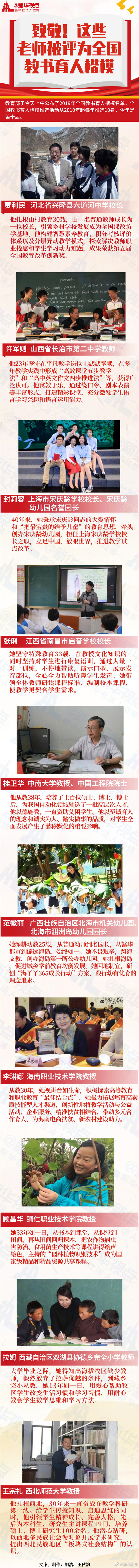 教育部教師工作司司長任友群介紹,全國教書育人楷模推選活動,今年是第10屆,每年推出10位。今年的10名獲獎(jiǎng)?wù)咧校薪處?人、女教師6人;年齡最大69歲、最小33歲;鄉(xiāng)村教師2人、少數(shù)民族3人。具體名單包括:河北省興隆縣六道河中學(xué)賈利民、山西省長治市第二中學(xué)許軍則、上海宋慶齡學(xué)校封莉容、江西省南昌市啟音學(xué)校張俐、中南大學(xué)桂衛(wèi)華、廣西北海市潿洲島幼兒園范徽麗、海南職業(yè)技術(shù)學(xué)院李琳娜、銅仁職業(yè)技術(shù)學(xué)院顧昌華、西藏自治區(qū)雙湖縣協(xié)德鄉(xiāng)完全小學(xué)拉姆、西北師范大學(xué)王宗禮。