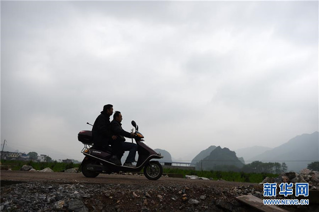 在廣西灌陽縣洞井瑤族鄉(xiāng),桂平巖小學老師趙仁斌(前)用電單車將楊大杰老師載去學校的路上(2016年3月24日攝)。2015年3月,楊大杰被診斷為股骨頭壞死,經過一段時間治療病情有所緩解后,他堅持帶病回到教學崗位上。新華社記者 陸波岸 攝