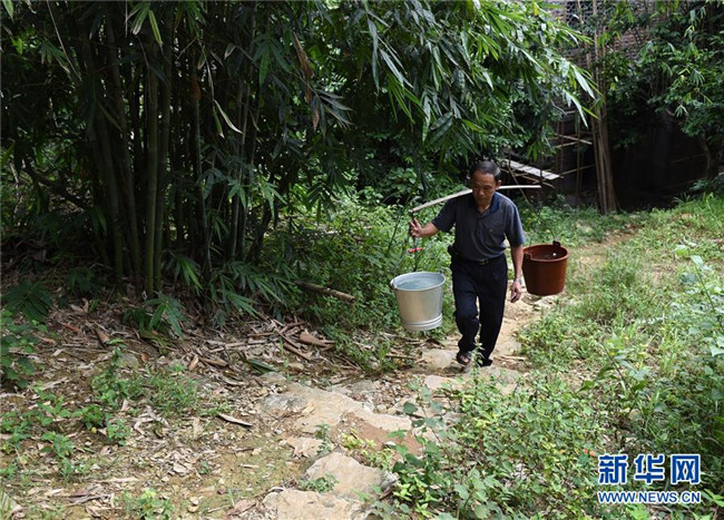 在廣西天等縣進結鎮(zhèn)愛樂村龍坡屯,龍坡教學點老師黃明料在教學點附近農家挑水回學校給學生做午飯(2015年9月10日攝)。新華社記者 陸波岸 攝