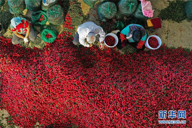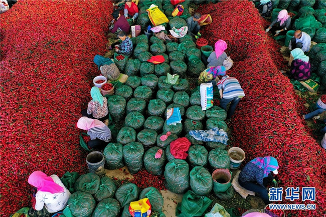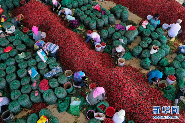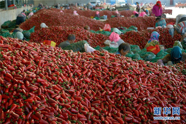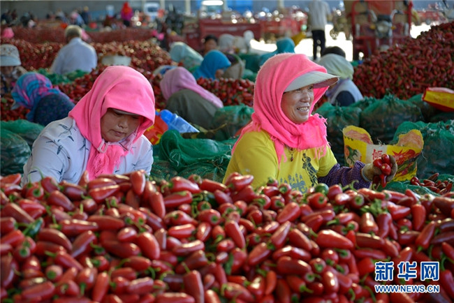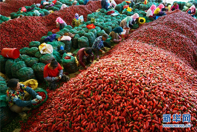 這是近日在甘肅省高臺(tái)縣拍攝的辣椒分揀、挑選場(chǎng)景。時(shí)下,高臺(tái)縣宣化鎮(zhèn)和駱駝城鎮(zhèn)種植的1700畝墨西哥辣椒進(jìn)入采摘和收購(gòu)期,火紅的辣椒堆積如山,映紅了農(nóng)民的笑臉。新華網(wǎng)發(fā)(鄭耀德 攝)