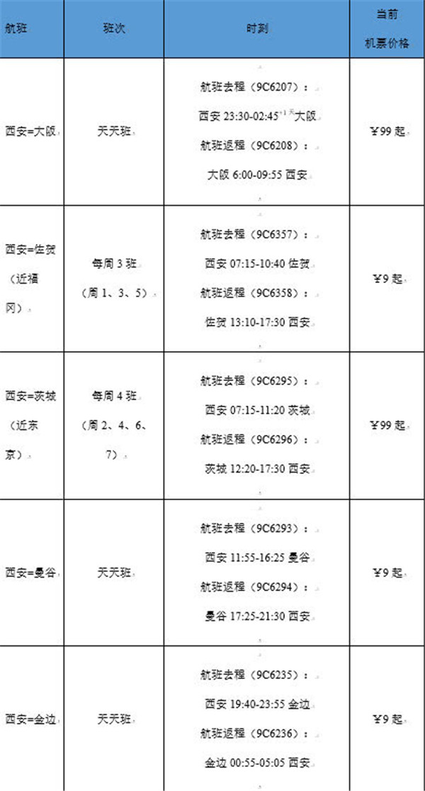 據(jù)了解,此次新開的航線及加密航線,將從2019年10月27日起陸續(xù)開始執(zhí)行,執(zhí)飛機(jī)型為空客A320。開航初期,機(jī)票價(jià)格相對(duì)優(yōu)惠,從春秋航空官網(wǎng)查詢到的價(jià)格來(lái)看,西安飛大阪、茨城(近東京)99元起(不含稅),西安飛佐賀(近福岡)、曼谷、金邊低至9元起(不含稅)。