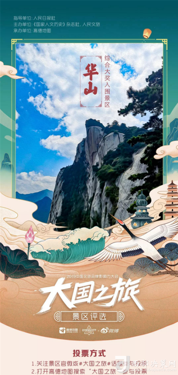 2019大國之旅景區(qū)評選活動由人民日報(bào)社指導(dǎo),《國家歷史人文》雜志社、人民旅游主辦,高德地圖承辦,于9月2日正式啟動。此次活動采取大眾投票+高德地圖旅游大數(shù)據(jù)+專家及媒體評審相結(jié)合的形式,得出最終獲獎(jiǎng)名單。游客通過新浪微博關(guān)注景區(qū)官博“ 大華山智慧旅游”為華山景區(qū)投票,智旅公司協(xié)助高德地圖完善了華山景區(qū)地圖板塊的校準(zhǔn)和更新,此次活動的開展,華山景區(qū)的品牌影響力和知名度也再次得到提升。