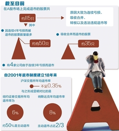 自2001年退市制度建立18年來,滬深交易所年均退市率依舊不足0.35%,主動(dòng)退市更是少之又少,遠(yuǎn)不能保障A股進(jìn)出平衡。與之形成鮮明對(duì)比的是,紐約證券交易所年均退市率為6%,約50%是主動(dòng)退市;納斯達(dá)克年均退市率8%,主動(dòng)退市占近2/3,而A股市場(chǎng)則大多是被動(dòng)退市,極少有主動(dòng)退市的情況。