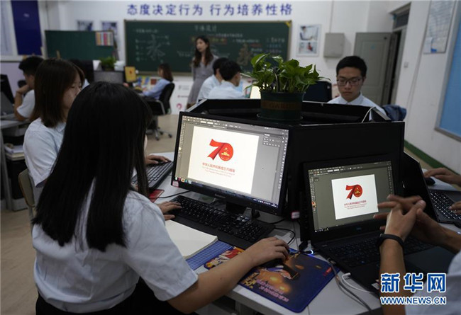9月18日,邢臺(tái)技師學(xué)院的學(xué)生在平面設(shè)計(jì)課程上臨摹慶祝中華人民共和國(guó)成立70周年活動(dòng)標(biāo)識(shí)。