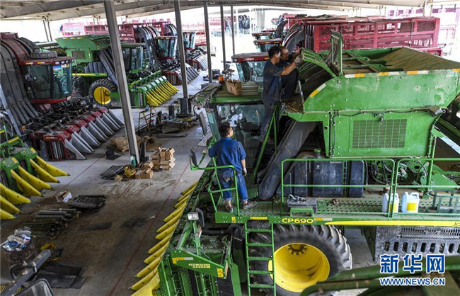 在位于新疆生產(chǎn)建設(shè)兵團第六師五家渠市的新疆準噶爾銀豐農(nóng)機裝備有限公司內(nèi),檢修人員在檢修保養(yǎng)采棉機(7月31日攝)。 新華社記者 王菲 攝