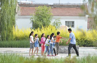 永寧縣原隆村的孩子們?cè)谛戮忧暗男蓍e廣場(chǎng)上玩耍。攝于2018年8月。新華社記者 劉軍喜攝